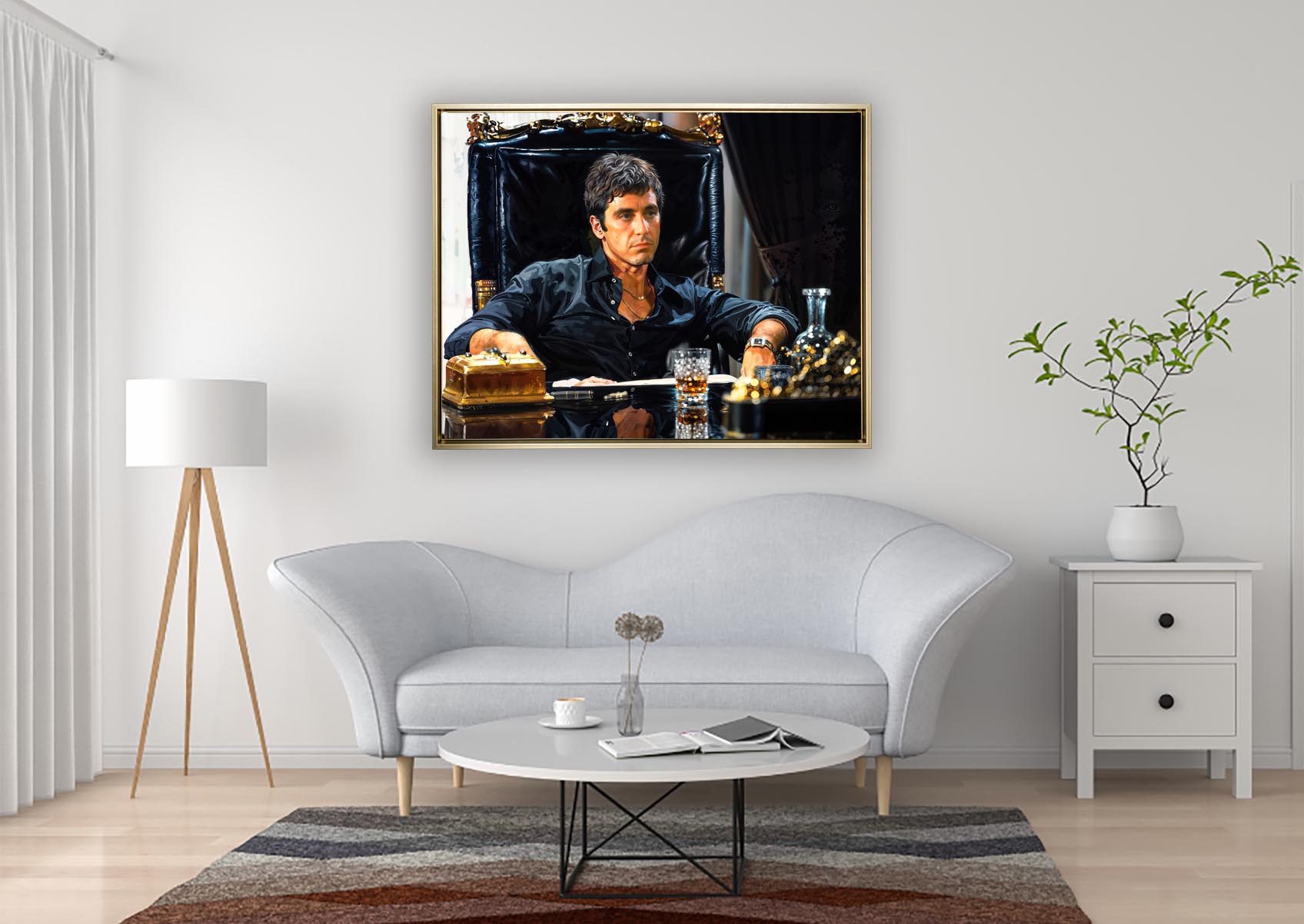 Elevate your home decor with this stunning and detailed canvas wall art featuring the iconic Tony Montana (Al Pacino) from Scarface. The imponent and luxurious black chair, gold accents, dark velvet curtains, and elegant desk with a glass of vodka all showcase the power and opulence of the iconic film scene. Perfect for adding a touch of sophistication to any space. Wall decor dining room