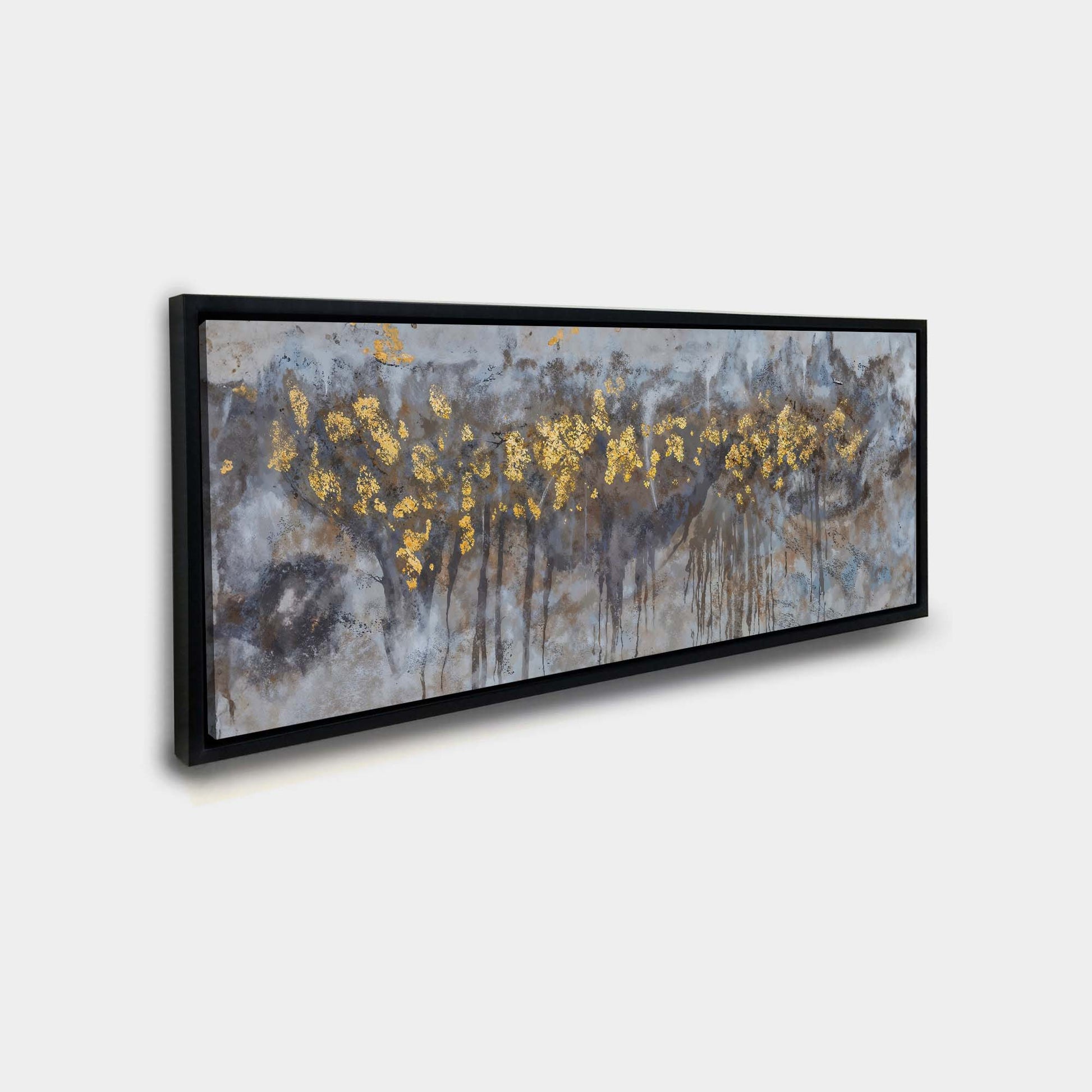 Bring a touch of sophistication and elegance to your home or office with this one-of-a-kind abstract canvas artwork. The gold and slate blue background provides the perfect complement to the modern trees, creating a statement piece that is truly original. Elevate any space with this unique artwork, sure to impress and stand out amongst the rest.