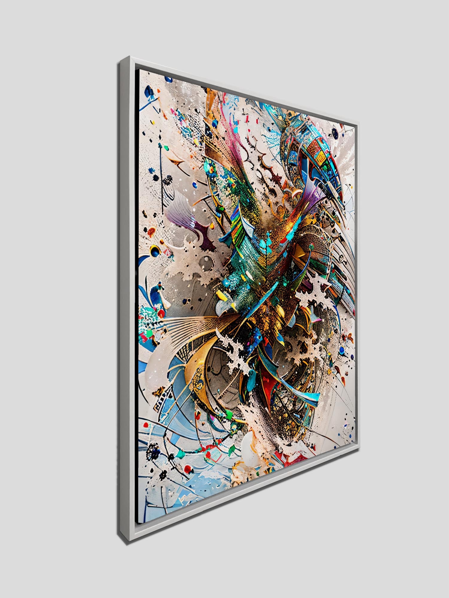This stunning canvas print is a masterfully crafted blend of vibrant colors and striking silhouettes against a serene white and blue backdrop. The intricate layers and textures create a mesmerizing visual that will transport you to another world. Perfect for both home and office, this bold piece adds a burst of energy to any space.