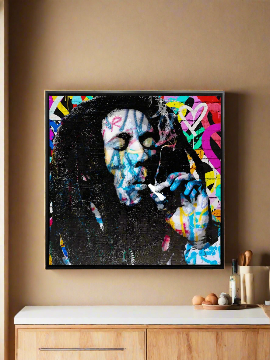 This stunning Canvas showcases the iconic reggae legend, Bob Marley, in a picturesque pop art style. The vibrant graffiti background adds to the allure and makes it a perfect piece for urban art enthusiasts and fans of the reggae genre.