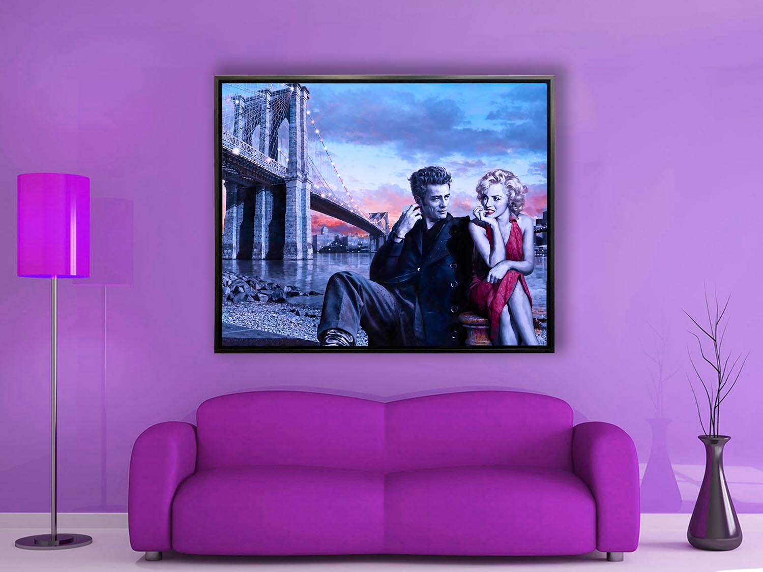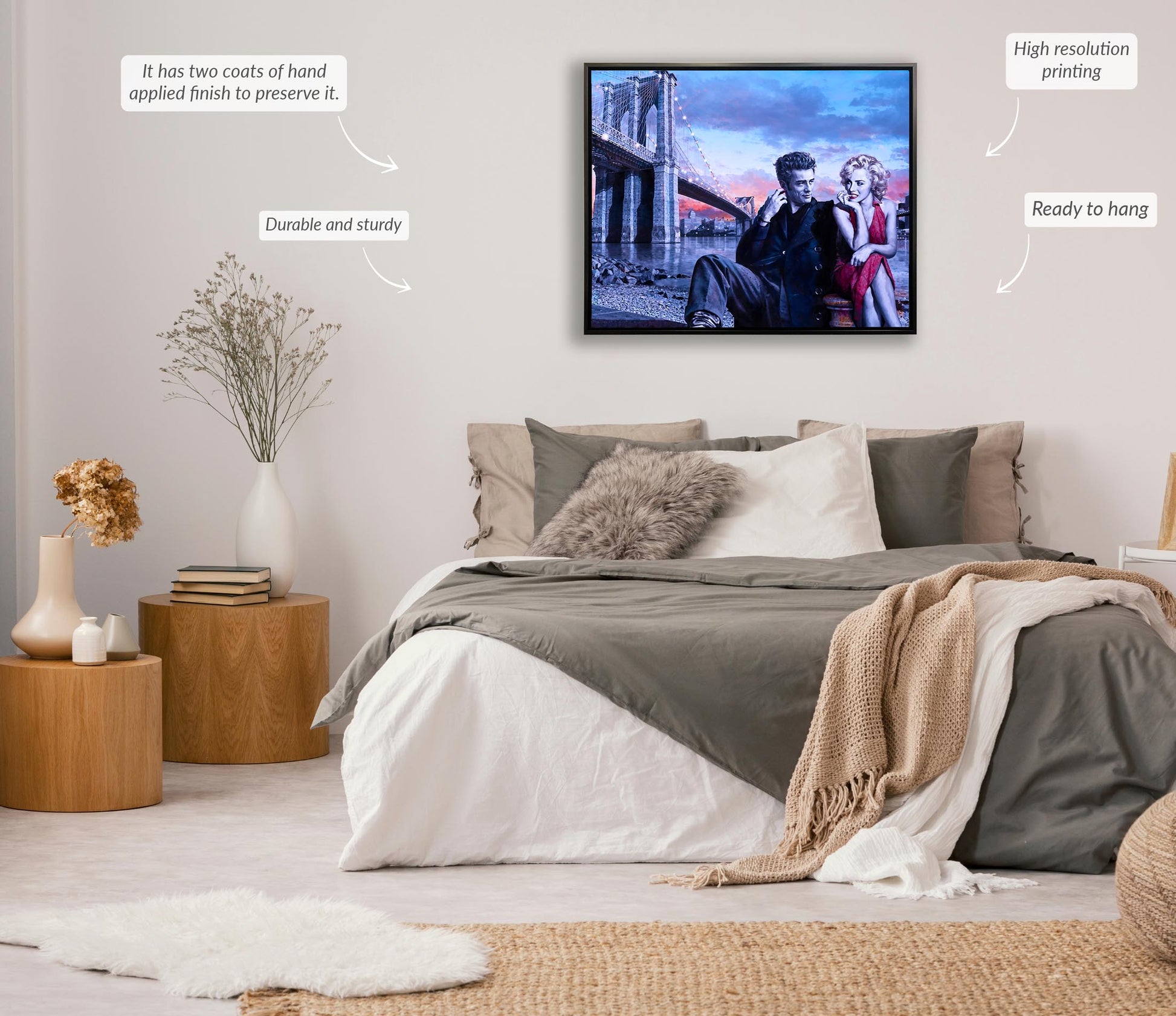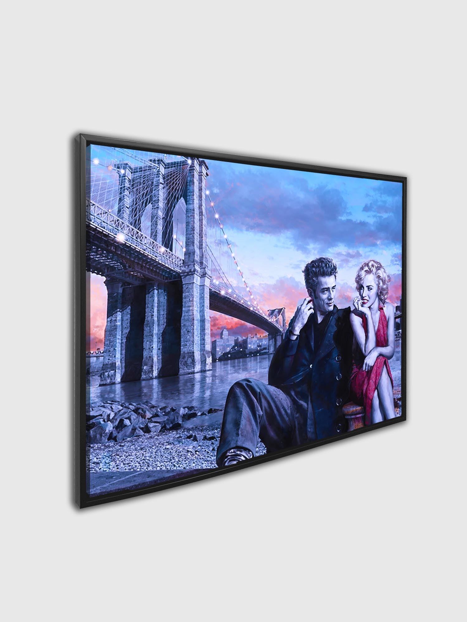 This canvas print showcases two iconic figures, James Jimmy Dean and Marilynn Monroe, in their prime, set against the backdrop of the famous Brooklyn Bridge and a breathtaking sunset sky. With exceptional digital design, it's a unique tribute to two legendary individuals.