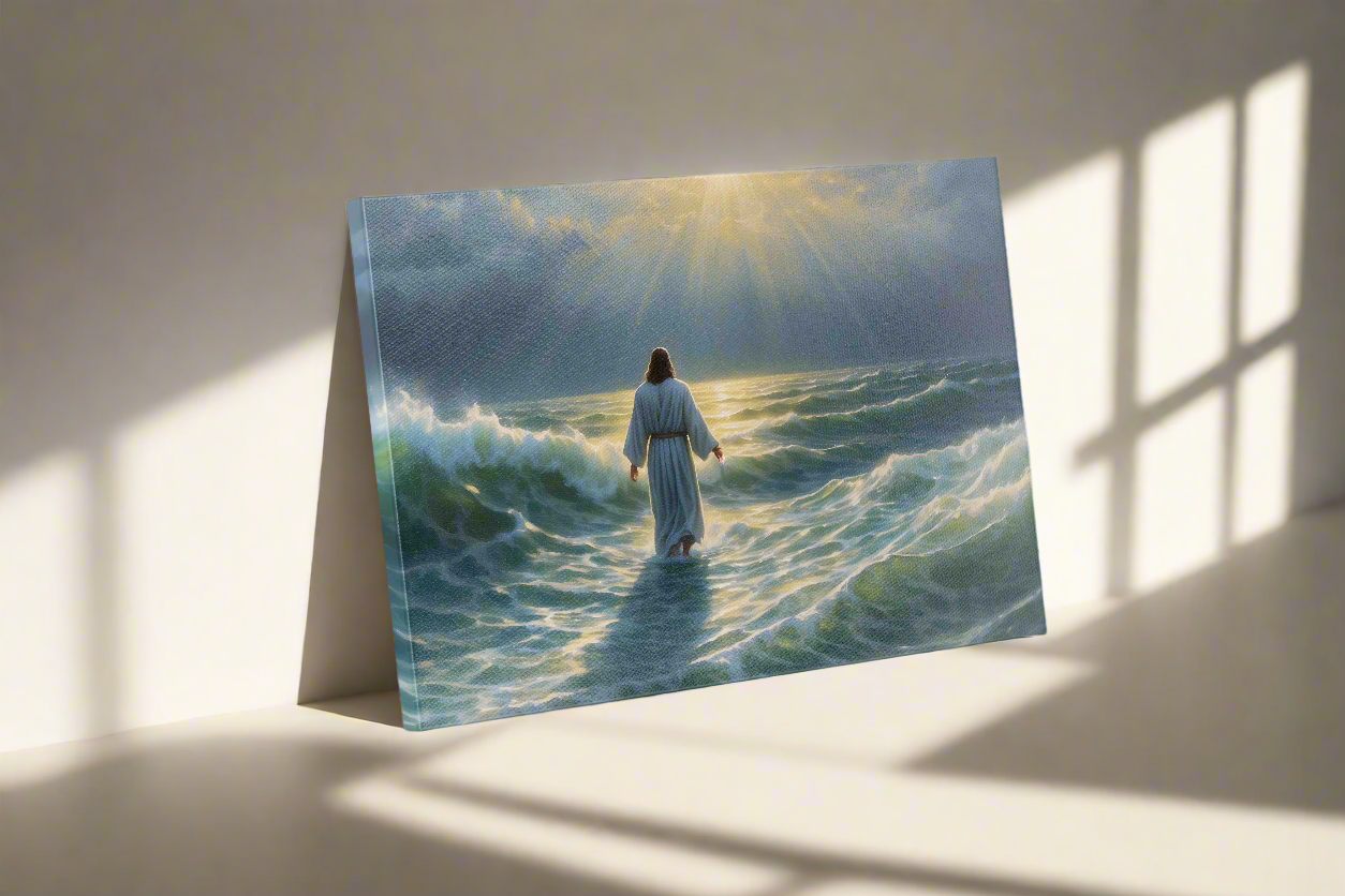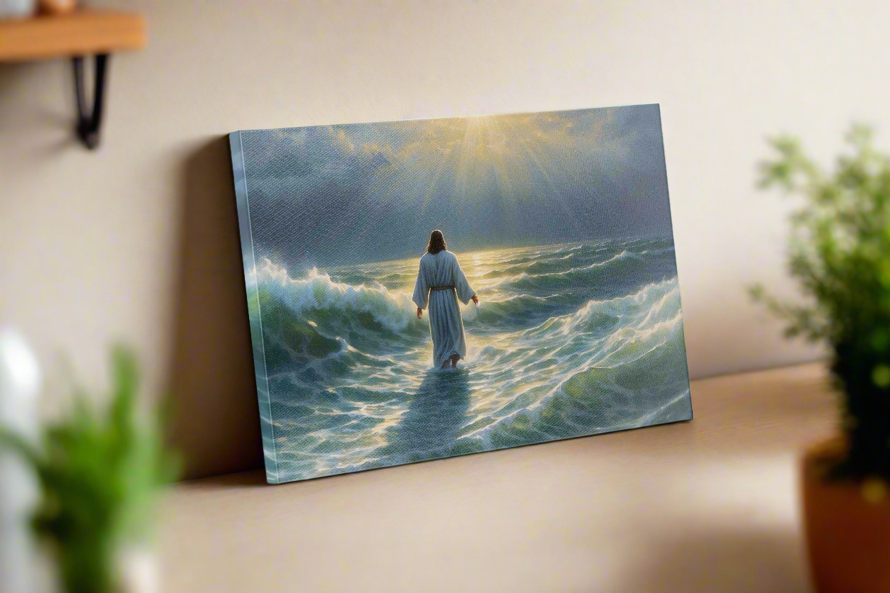 This image showcases the remarkable and profound event of Jesus walking on water, symbolizing the difficulties faced in a spiritual journey. The sunset's radiance and the ocean's palette of blues and whites make this a captivating piece, perfect for enhancing any space.