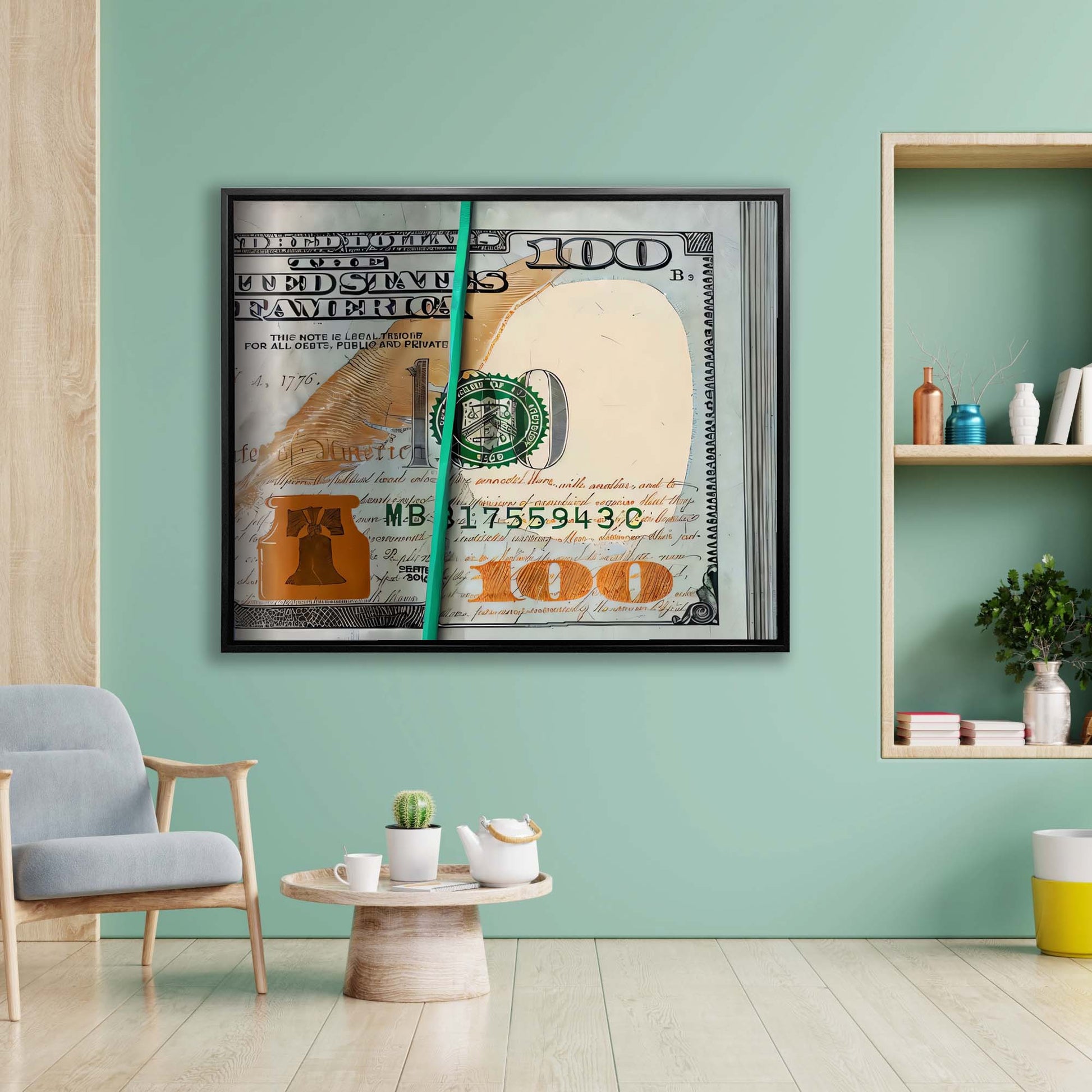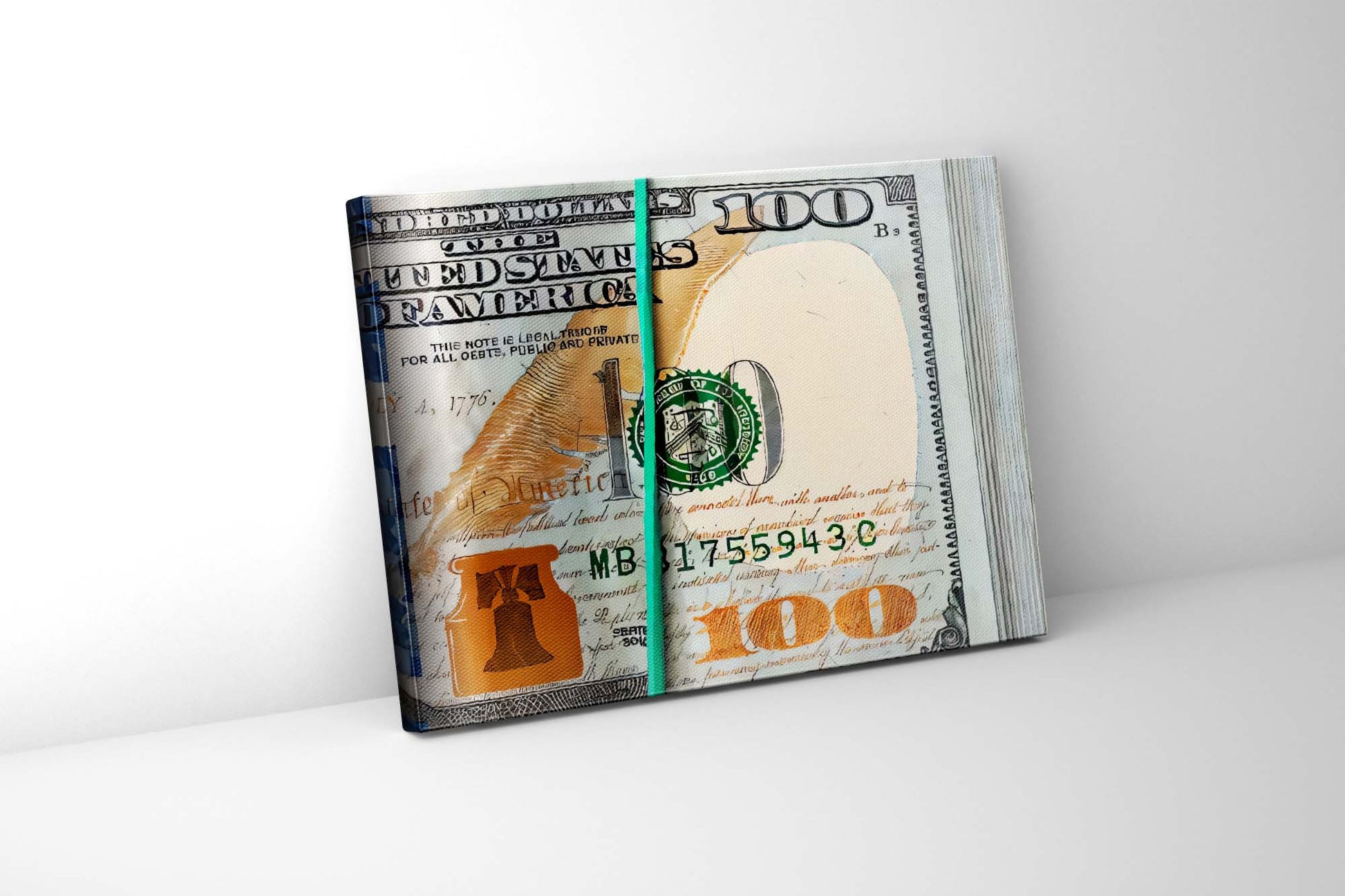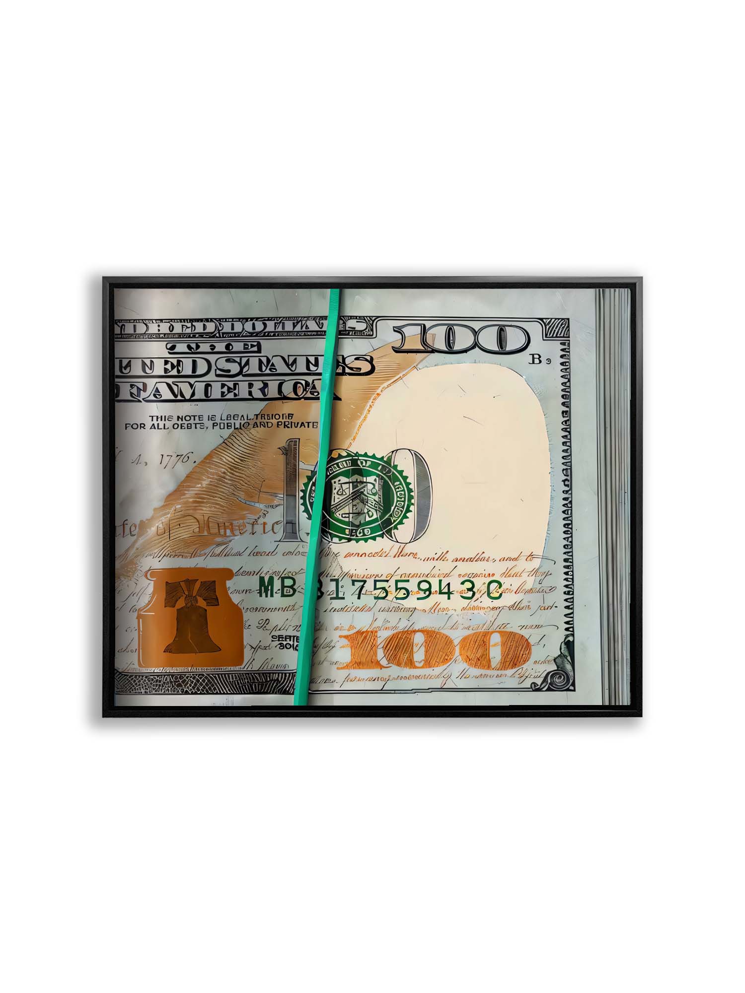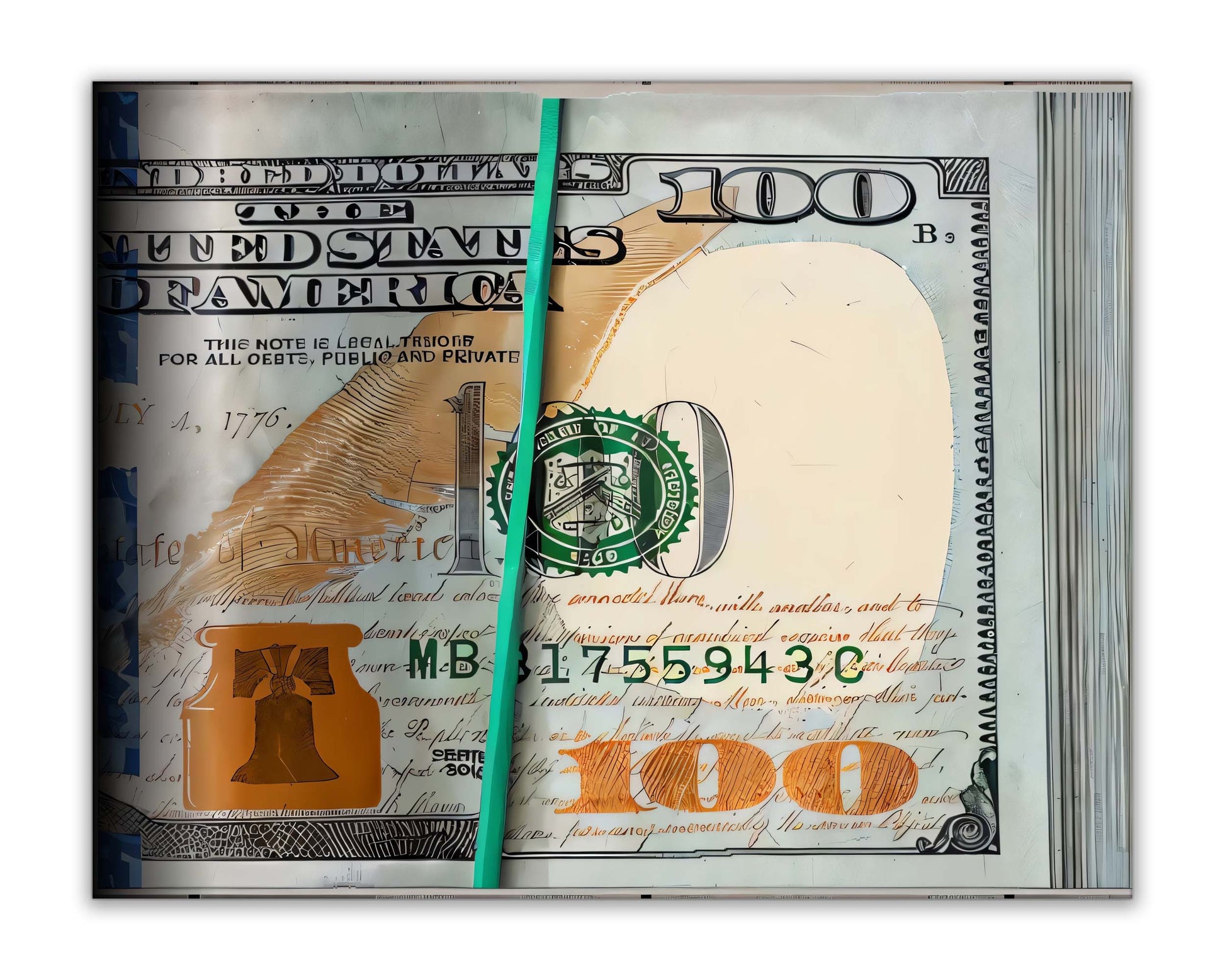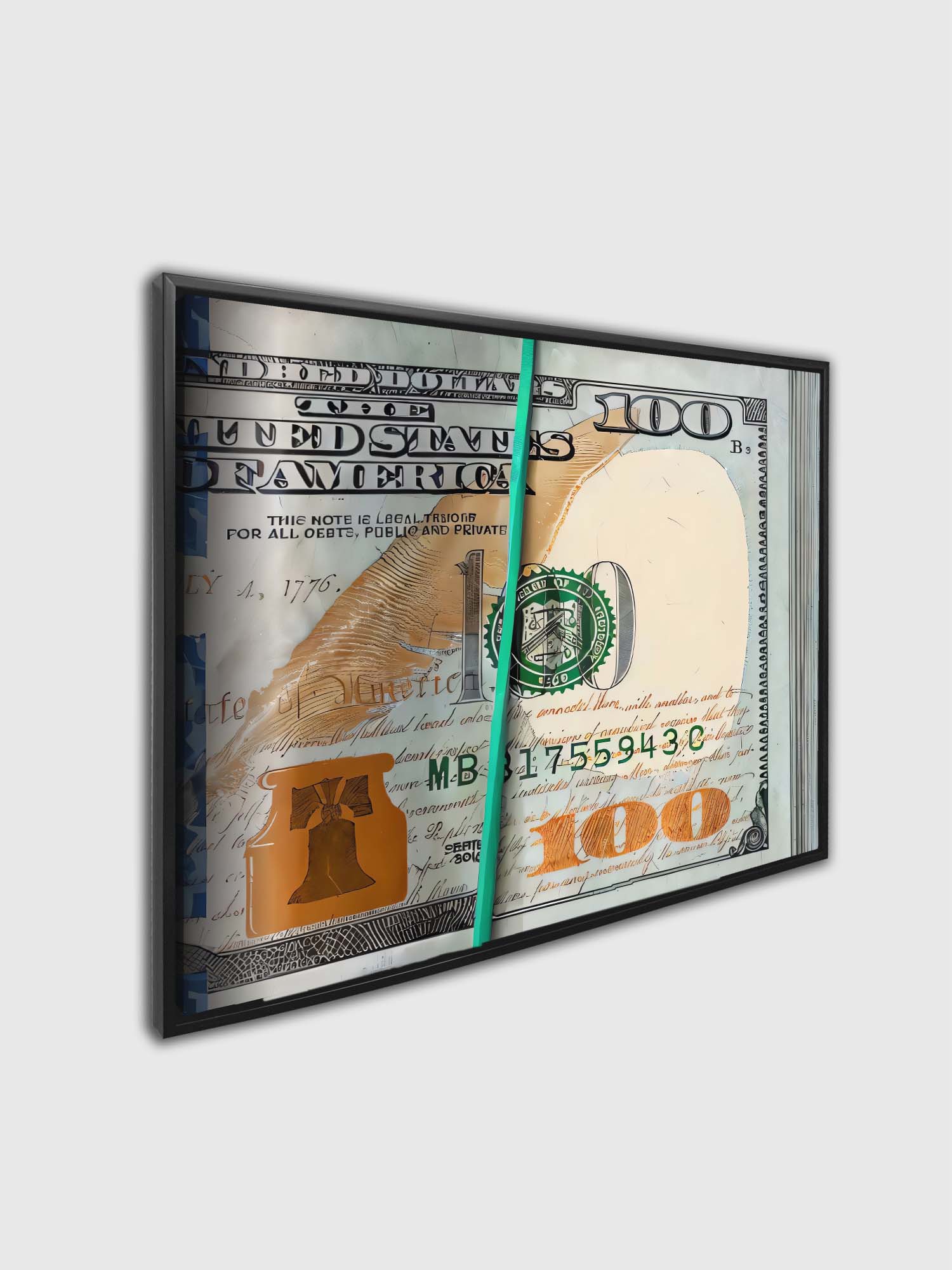 Enhance any room with a touch of humor and style with this 48" x 36" fine art canvas depicting a stack of hundred dollar bills with a green rubber in the center. Perfect for a bedroom or living room, this unique piece will make a lasting impression and elevate the atmosphere of any space.