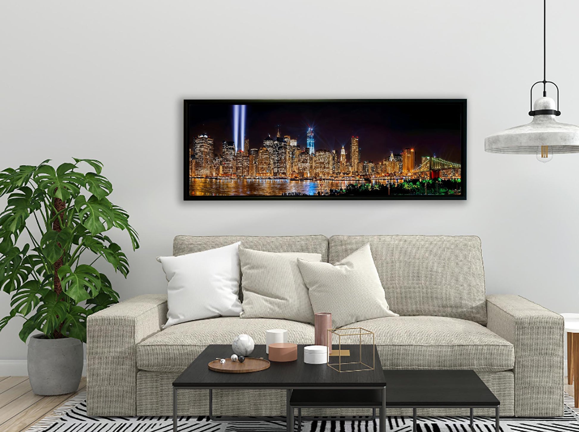 Elevate your space with a stunning tribute to the resilience and beauty of New York City. This art piece showcases the iconic Tribute in Light installation, created to honor and remember the victims of 9/11. Let this piece remind you of the strength and unity of our nation in the face of tragedy.