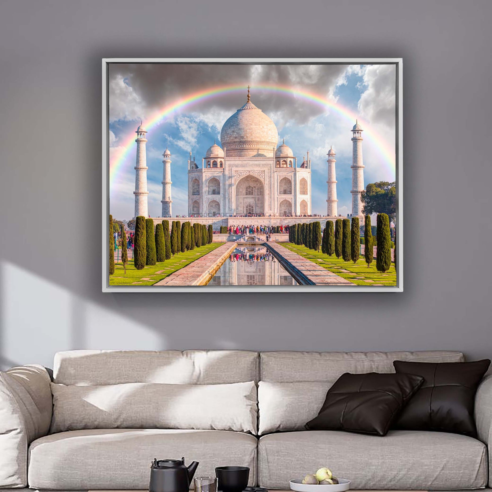 This one-of-a-kind wall art captures the splendor of Taj Mahal on a sunny day, complete with a beautiful rainbow and reflections in the water. Perfect for art and travel enthusiasts alike, this piece will add a touch of elegance to any space while transporting you to this iconic landmark.