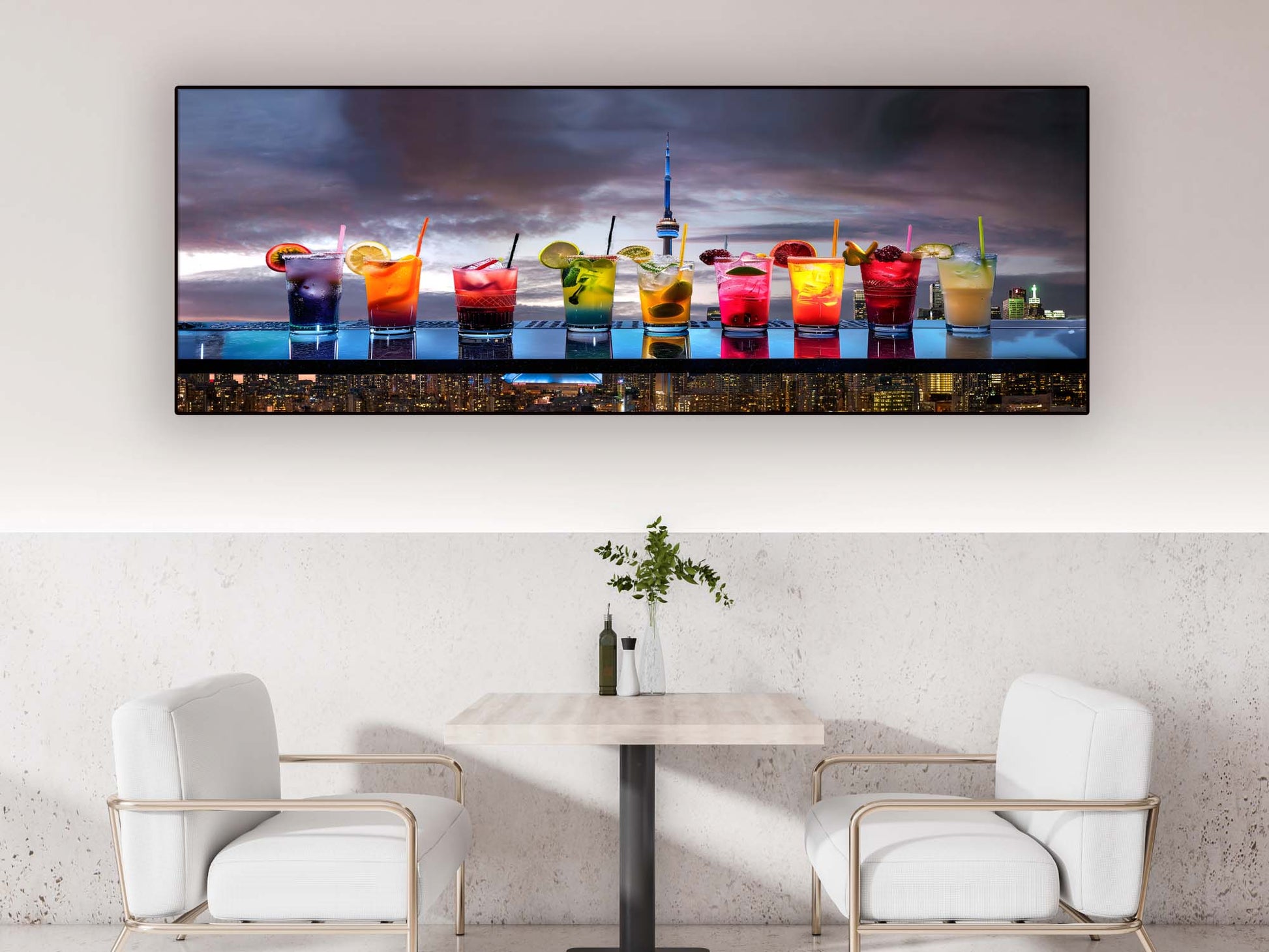 This canvas print showcases an incredible photo of a Toronto sunset. Enjoy a variety of colorful cocktails while admiring the stunning view of the CN tower. Perfect for decorating pubs, restaurants, or your own home, this piece is a unique addition to any space.